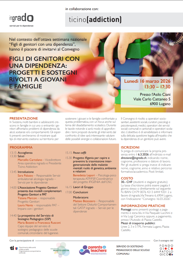 In Svizzera, molti bambini e adolescenti crescono in famiglie in cui uno o entrambi i genitori affrontano problemi di dipendenza da alcol, sostanze e/o comportamenti. Gli esperti presenti cercheranno di mostrare quali tipi di intervento esistono sul territorio per sostenere i giovani e le famiglie confrontate a questa problematica, con un focus anche sul tema del disadattamento scolastico. Durante le tavole rotonde si avrà modo di approfondire i temi proposti durante gli interventi; dal confronto di idee sarà interessante valutare delle possibili sinergie e collaborazioni future. Il Convegno è rivolto a operatori sociosanitari, assistenti sociali, curatori, psicologi e psicoterapeuti, medici, operatori dei servizi sociali comunali e cantonali e operatori scolastici. L’obiettivo è di sensibilizzare e informare sulla delicata questione legata all’impatto che la dipendenza di un genitore può avere.